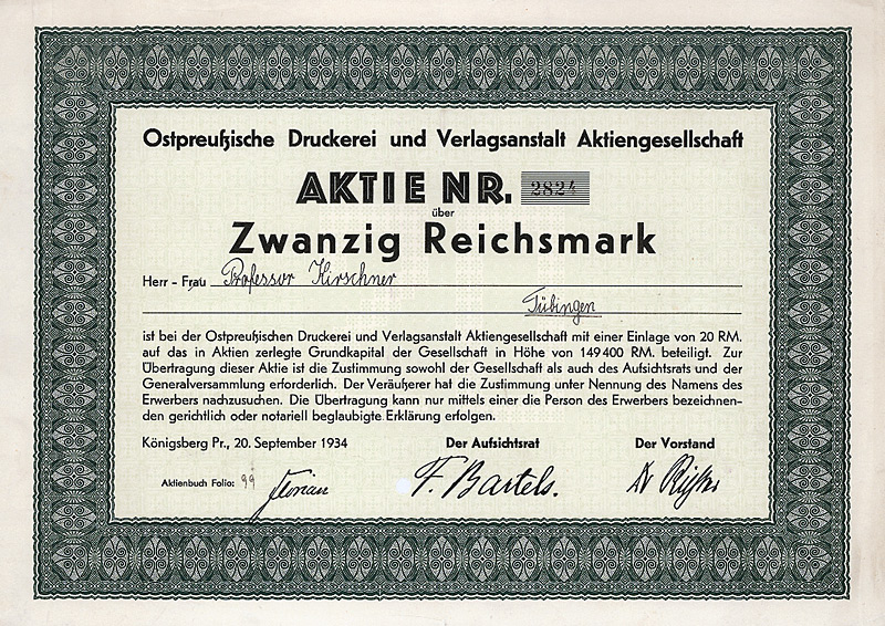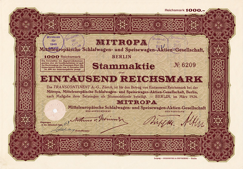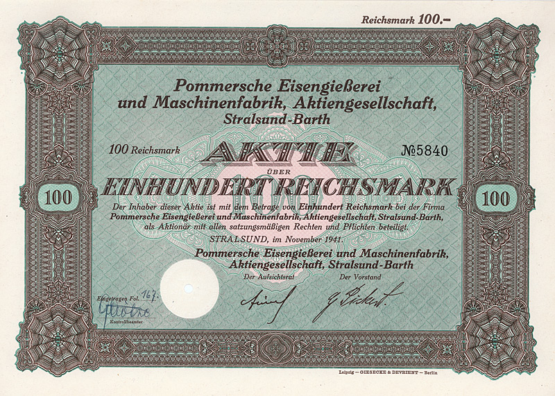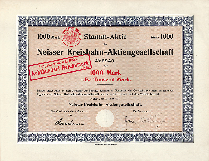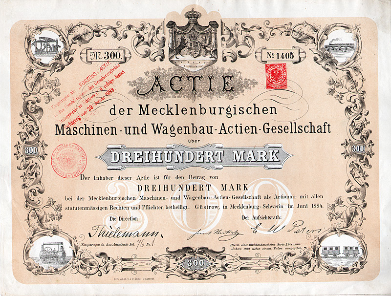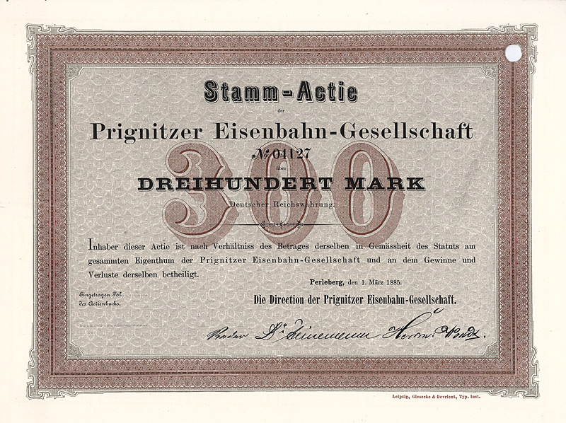 Gründeraktie, Auflage 4.500. Konzessioniert wurde die Prignitzer Eisenbahn 1884 für den Bau und Betrieb der 45 km langen Nebenbahn von Perleberg über Pritzwalk nach Wittstock (Dosse). 1895 wurde die Bahn von Wittstock (Dosse) aus um weitere 16,5 km bis zur preußisch-mecklenburgischen Grenze verlängert. Auf preußischer Seite schloß daran das 1,8 km lange Gleis zum Bahnhof Buschhof an, wo Anschluß an das Netz der Mecklenburgischen Friedrich-Wilhelm-Eisenbahn bestand. 1900 wurde der Prignitzer Eisenbahn auch die Betriebsführung der Ostprignitzer Kreiskleinbahnen (29 km normalspurige Kleinbahnen und 70 km Schmalspurbahnen in 750-mm-Spur) sowie der Westprignitzer Kreiskleinbahnen (63 km Normalspur und 31 km Schmalspur) übertragen. 1932 wurde der Betrieb der Wittenberge-Perleberger Eisenbahn, deren Eigentümer die Stadtgemeinde Perleberg war, mit der Prignitzer Eisenbahn zusammengelegt. Großaktionäre waren zuletzt das Land Preußen (13,83 %), die Provinz Brandenburg (9,6 %), die Kreise Ost- und West-Prignitz (20,6 %) sowie eine Reihe nahe der Strecke liegender Städte (23,5 %). Die Vorzugs-Stammaktien waren in Berlin börsennotiert. Als in dieser Beziehung absolute Ausnahmeerscheinung unter den deutschen Klein- und Nebenbahnen war die Prignitzer Eisenbahn ungewöhnlich rentabel und völlig schuldenfrei und erzielte Betriebsgewinne von bis zu 25 % vom Umsatz, und zwar nach Steuern! Entsprechend konnten bis Anfang der 40er Jahre kontinuierlich Dividenden bis zu 7,5 % gezahlt werden. Im Zuge der letzten großen Eisenbahn-Verstaatlichungswelle 1941 als Ganzes ohne Abwicklung auf das Deutsche Reich (Reichseisenbahnvermögen) übergegangen. Dekorativer G & D-Druck. Obwohl die Börsenhandbücher der 30er/40er Jahre die Gesamtauflage von 4500 Aktien als aktuell umlaufende Vorzugs-Stammaktien angeben, ist aus unerklärlichen Gründen bei gut 10 % der Auflage (so auch bei diesem Stück, das nummeriert ist, aber keine Kontrollunterschrift hat) die Anbringung eines Reichsmark-Umstellungsstempels unterblieben; ebenso ist kein einziger Kupon von dem als Doppelblatt mit der Aktie verbundenen Kuponbogen getrennt. Maße: 23 x 30,7 cm.
