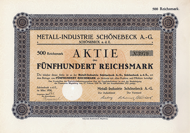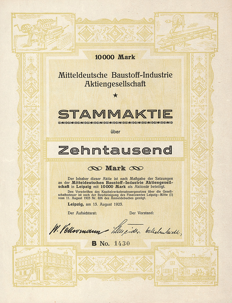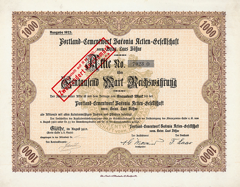 Aulage 2.500 (R 9). Von der Vorgängerfirma wurde bereits seit 1864 ein Kalkwerk und eine Ziegelei betrieben, seit 1889 auch Fabrikation von Portland-Cement. AG seit 1899. In Berlin börsennotierte Familiengesellschaft. Nach 1946 VEB Zementwerk Bernburg, nach der Privatisierung 1990 von der Woermann Bauchemie GmbH & Co. KG, zugehörig zur Schwenk Zement KG in Ulm, erworben, 2003 an Degussa weiter gegeben. Sehr dekorativ, großes Wappen im Unterdruck. Maße: 26,3 x 33,4 cm. Mit restlichen Kupons. Nicht entwertetes Stück in einem überdurchschnittlich guten Erhaltungszustand!