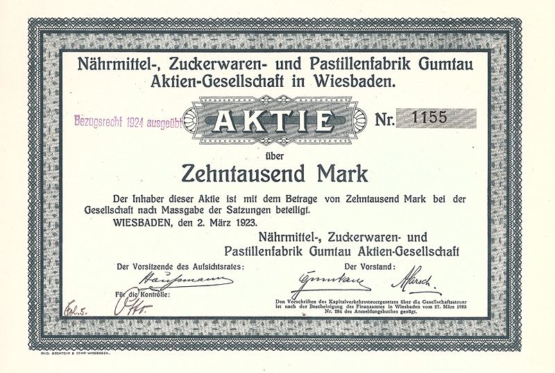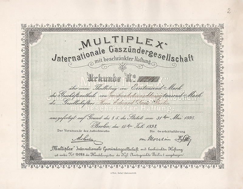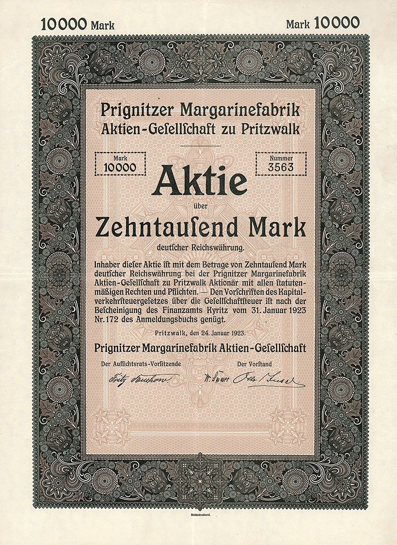 Gründeraktie, Auflage 2.000 (R 9). Gründung am 25.1.1923. Herstellung von Margarine und verwandten Produkten. Bereits am 2.7.1924 wurde das Konkursverfahren eröffnet. Maße: 36,7 x 27,3 cm.