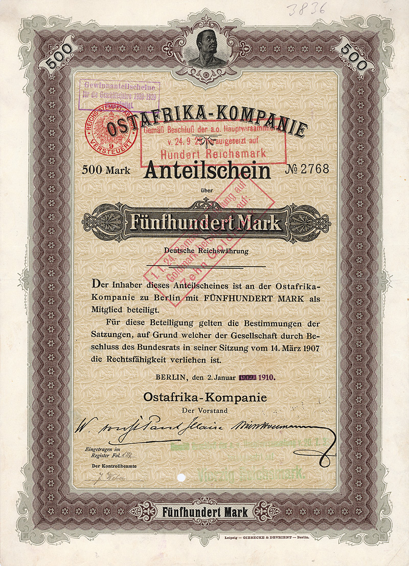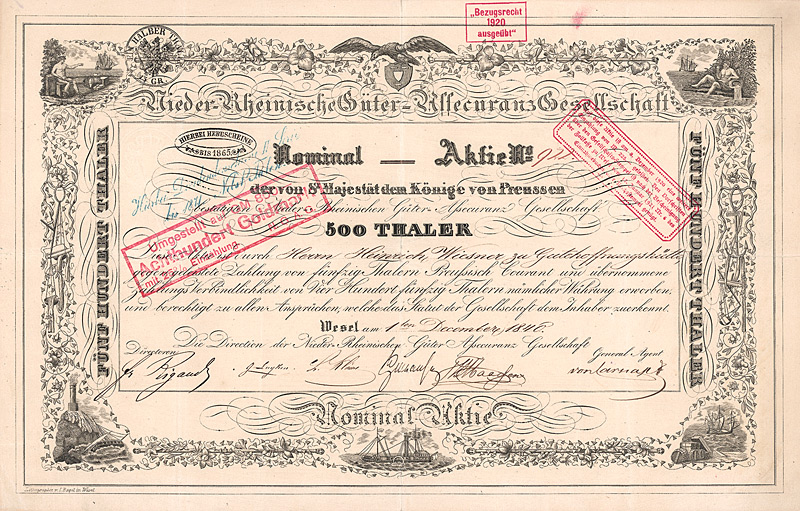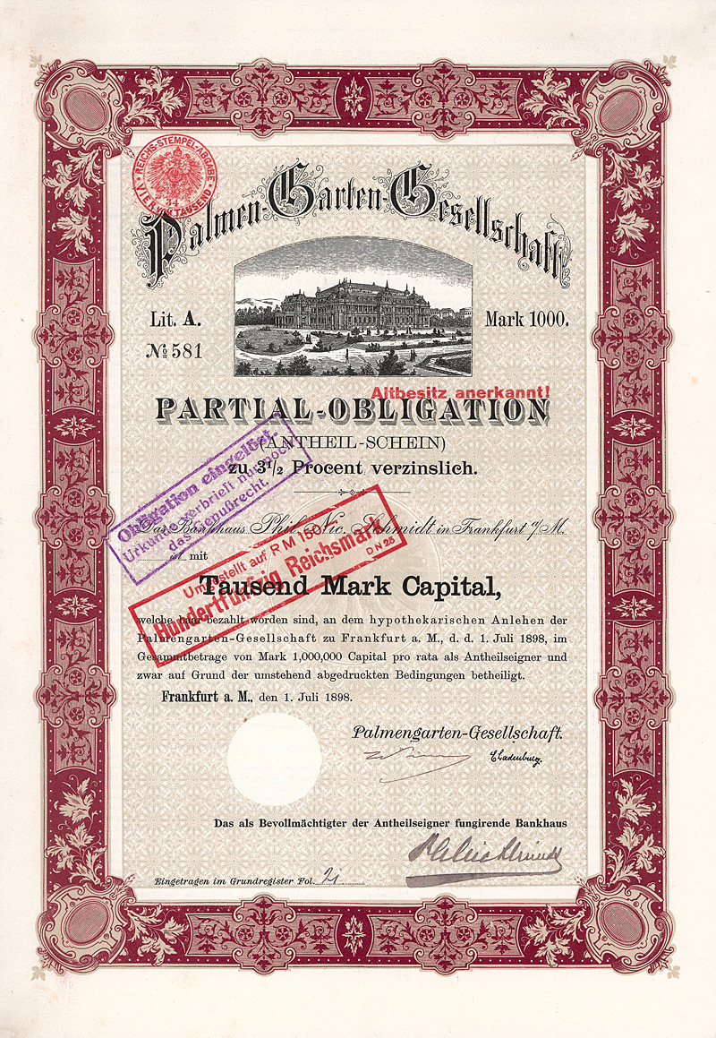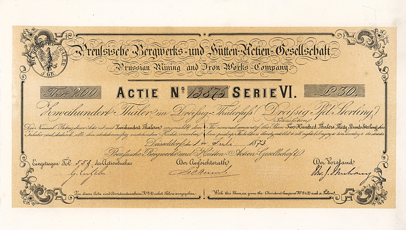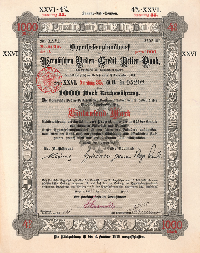 Gründeremission, Auflage 50.000 (R 8). Das von den Initiatoren unter Führung des Geh. Admiralitätsrates Stephan vorgelegte Statut datiert vom 21.12.1868 und war vom König von Preußen zu genehmigen: die Gründung einer Aktiengesellschaft war vor Inkrafttreten des Aktiengesetzes kein selbstverständliches Recht, sondern ein landesherrliches Privilegium. Erteilt wurde die landesherrliche Genehmigung nur, wenn die Behörden vom Nutzen des Unternehmens für die wirtschaftspolitischen Ziele zu überzeugen waren. Die Preußische Boden-Credit-Actien-Bank wurde zu einer sehr erfolgreichen Gründung. 1921-1925 Zusammenschluss mit der Deutschen Hypothekenbank Meiningen, der Westdeutschen Bodenkreditanstalt in Köln, der Norddeutsche Grund-Credit-Bank in Weimar, der Frankfurter Pfandbrief-Bank, der Schlesischen Boden-Credit-Actien-Bank in Breslau, der Leipziger Hypothekenbank und der Mecklenb. Hypotheken- und Wechselbank in Schwerin zur “Gemeinschaftsgruppe deutscher Hypothekenbanken”. 1930 Fusion mit der Preußischen Pfandbrief-Bank und der Preußischen Central-Boden-Credit-AG zur Deutschen Centralbodenkredit-AG. Als solche jahrzehntelang eine Tochtergesellschaft der Deutschen Bank und die größte reine Hypothekenbank in Deutschland. 1995/98 Fusion mit den beiden anderen Hypothekenbank-Töchtern der Deutschen Bank (Frankfurter Hypothekenbank AG und Lübecker Hypothekenbank AG) zur “EUROHYPO AG Europäische Hypothekenbank der Deutschen Bank”, 2001 schließlich gingen in der EUROHYPO auch noch die Realkredit-Töchter der Commerzbank AG (Rheinische Hypothekenbank AG) und der Dresdner Bank AG (Deutsche Hypothekenbank Frankfurt-Hamburg AG) auf. Heutiger Großaktionär ist die Commerzbank. Die Aktie ist eine einmalig schöne Arbeit der Preußischen Staatsdruckerei. Maße: 22,5 x 29,2 cm. Mitte der 80er Jahre wurden in einem Notariat im schottischen Glasgow ca. 15 dieser Aktien entdeckt (eine weitere Quelle hat es nie gegeben). Dort schlummerten fast ein Jahrhundert lang in einem Nachlaß völlig unbeachtet deutsche Wertpapiere, die, wären sie nur immer rechtzeitig eingereicht worden, heute ein zweistelliges Millionen-Vermögen bedeuten würden. Stattdessen wurde auch bei dieser Aktie, die im 1. Weltkrieg als “Feindvermögen” behandelt wurde, später die RM-Umstellung verabsäumt, obwohl die Bank selbst ja bekanntlich prosperierte.