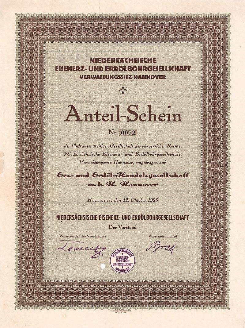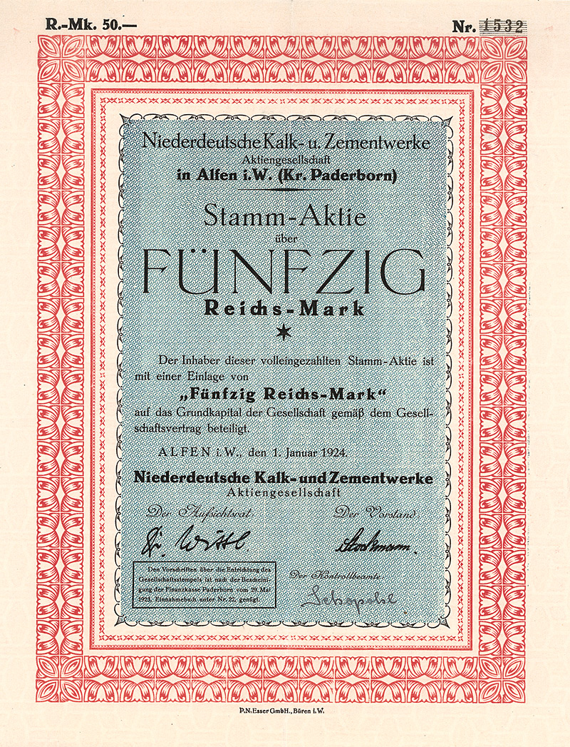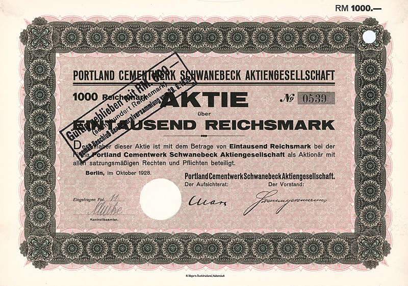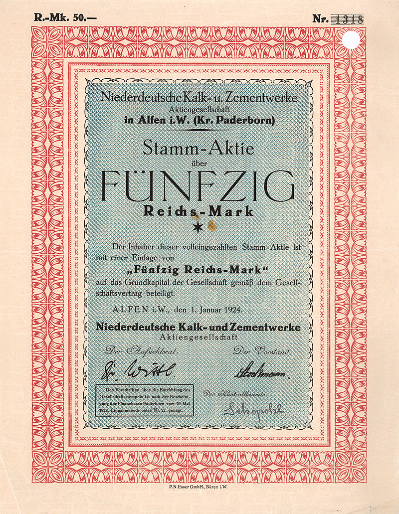 Aulage 800 (R 10). Gegründet 1906 unter Übernahme der seit 1897 bestehenden oHG Portland-Cementwerk. Großaktionär: Norddeutsche Portlandcementfabrik Misdorf, Hannover. Firmenmantel: 1949 verlagert nach Hannover, ab 1953 GmbH. Lochentwertet. Maße: 21 x 29,8 cm. Nur 5 Stücke sind bis heute erhalten geblieben!