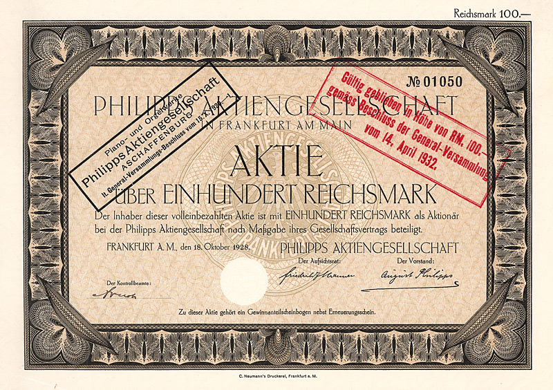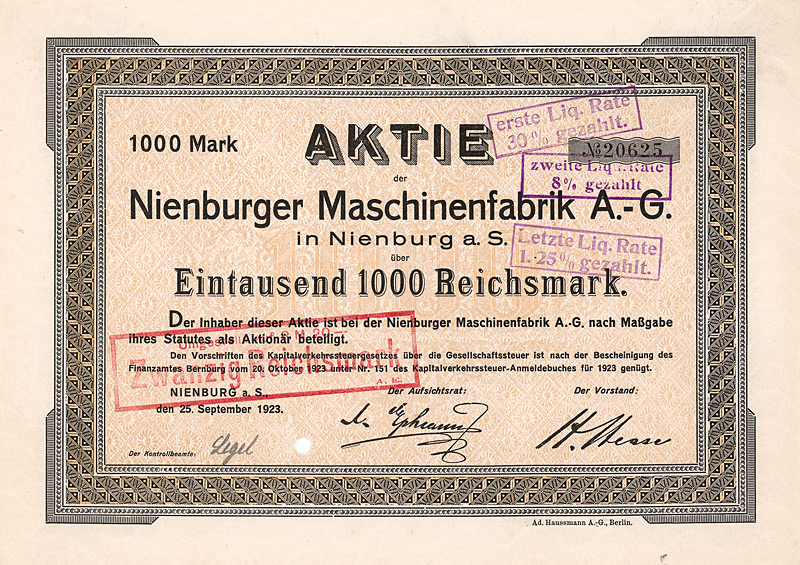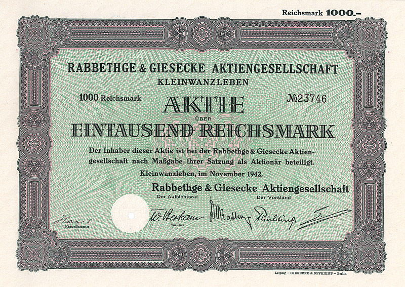 Gründung bereits 1838, AG seit 1885 als “Zuckerfabrik Klein-Wanzleben”. Schon immer war der wichtigste Geschäftszweig aber die Zuckerrübensamenzucht. Bereits 1902 kaufte die Ges. die Zuckerfabrik Seehausen. 1920/21 wurde der Großteil der Anteile der Zuckerfabrik Wrede & Sohn in Oschersleben übernommen. 1938 umbenannt in “Rabbethge & Giesecke AG”, bei dieser Gelegenheit kompletter Neudruck der Aktien. Nach 1945 fädelte die sehr strategisch denkende englische Besatzungsmacht schleunigst die Sitzverlegung nach Einbeck ein, dort bis heute (ab 1968 als KWS Kleinwanzlebener Saatzucht AG firmierend) ein viel beachteter Regionalwert an der Börse Hannover. Maße: 21 x 29,8 cm. Prägesiegel lochentwertet. |
