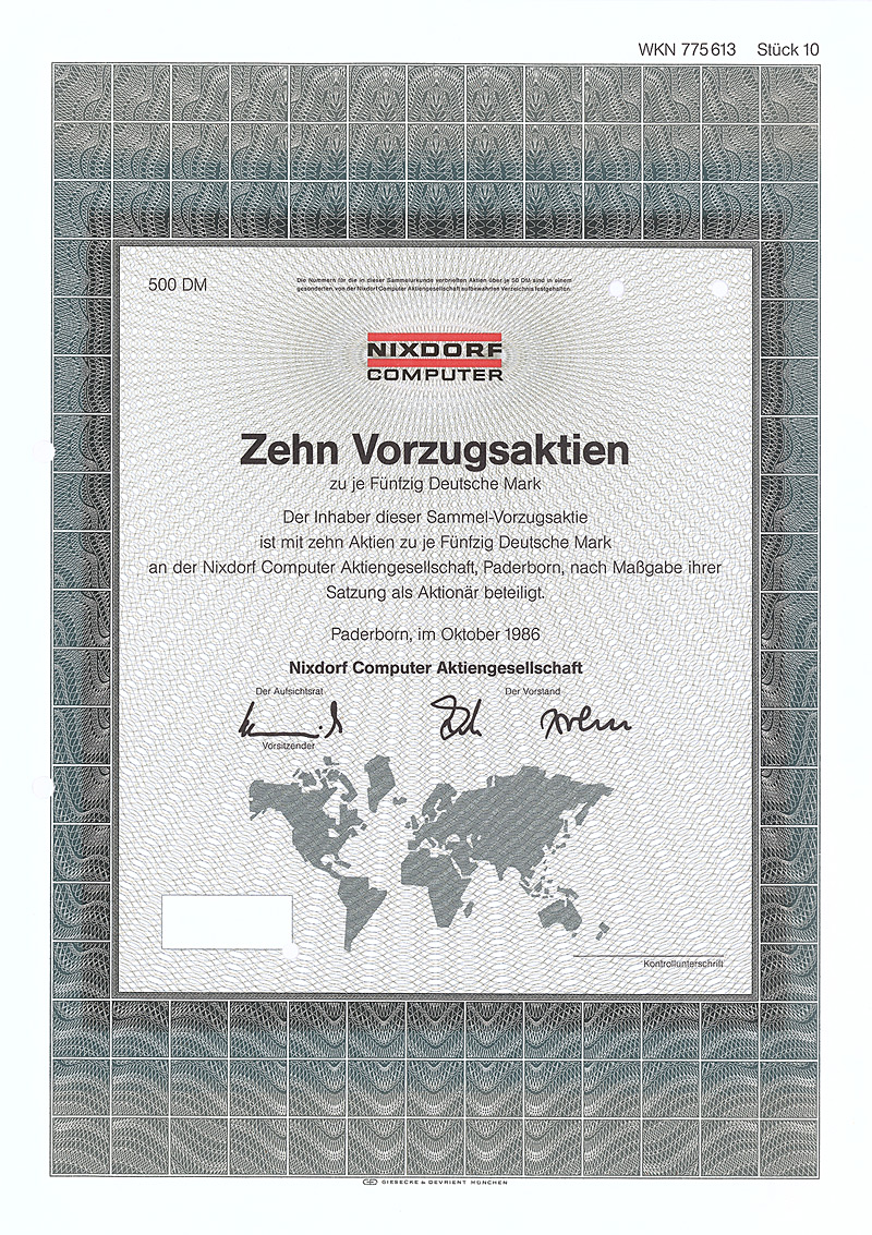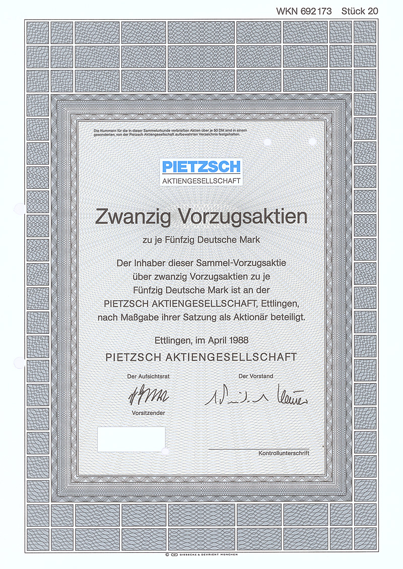 (R 10) Seit 1965 beschäftigte sich das Inginieurbüro Dr.-Ing. Ludwig Pietzsch mit Fragen im Grenzbereich zwischen Maschinenbau und Elektronik. 1968 Gründung der PAT Prozeß-Automatisierungs-Technik GmbH & Co KG für das ungemein erfolgreiche Geschäftsfeld “Kransicherheitstechnik”, 1971 kam die Verkehrsmeßtechnik hinzu, 1973 die Formmeßtechnik. Seit 1981 auch Herstellung von Sensoren. 1986 Übernahme des Geschäftsbetriebs der Ernst Heinkel Maschinenbau GmbH, die Teile für die Flugzeugindustrie herstellte. 1988 Umwandlung in eine AG (reine Holding mit zuletzt 25 operativen Töchtern) und Gang an die Börse. Maße: 29,7 x 20,9 cm. Lochentwertet, Abheftlochung. Mit Kupons.