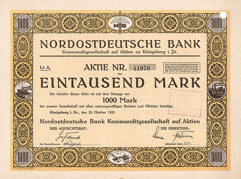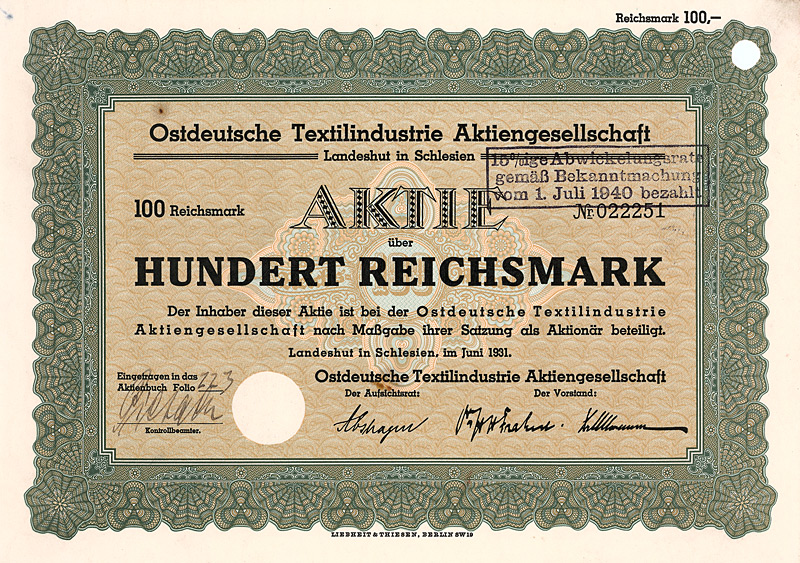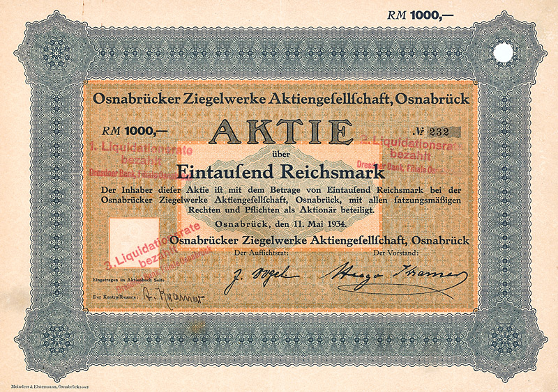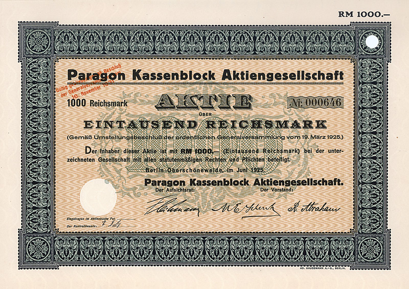 Aktie 1.000 Mark, Nr. 73940