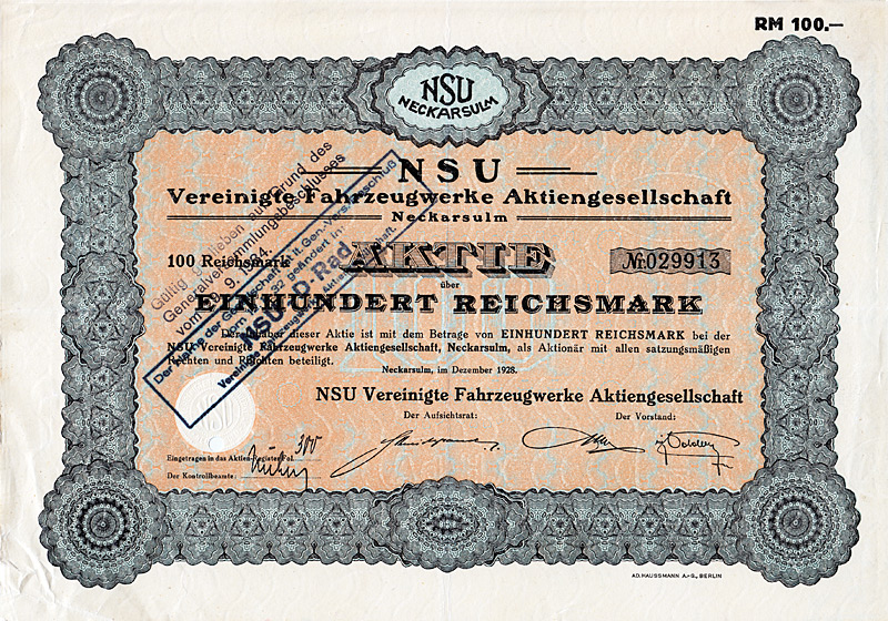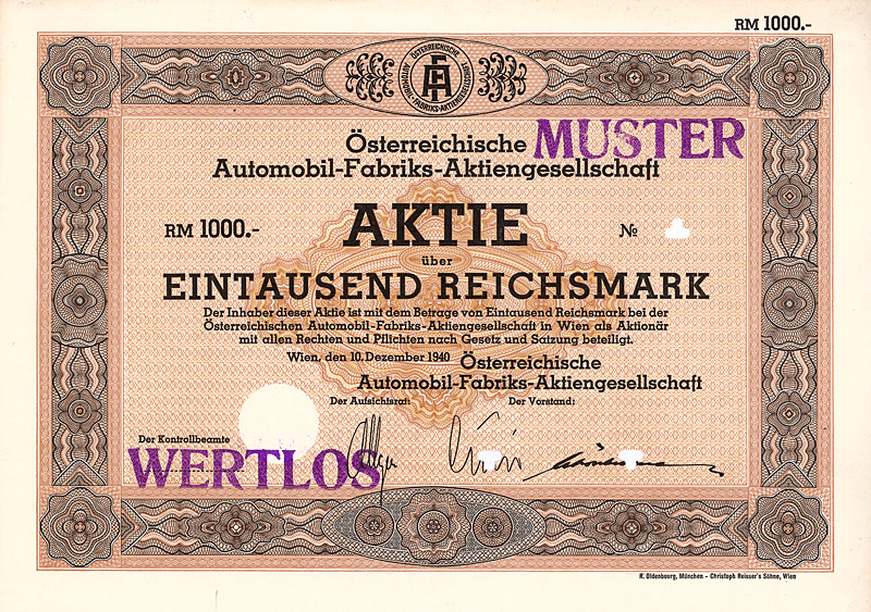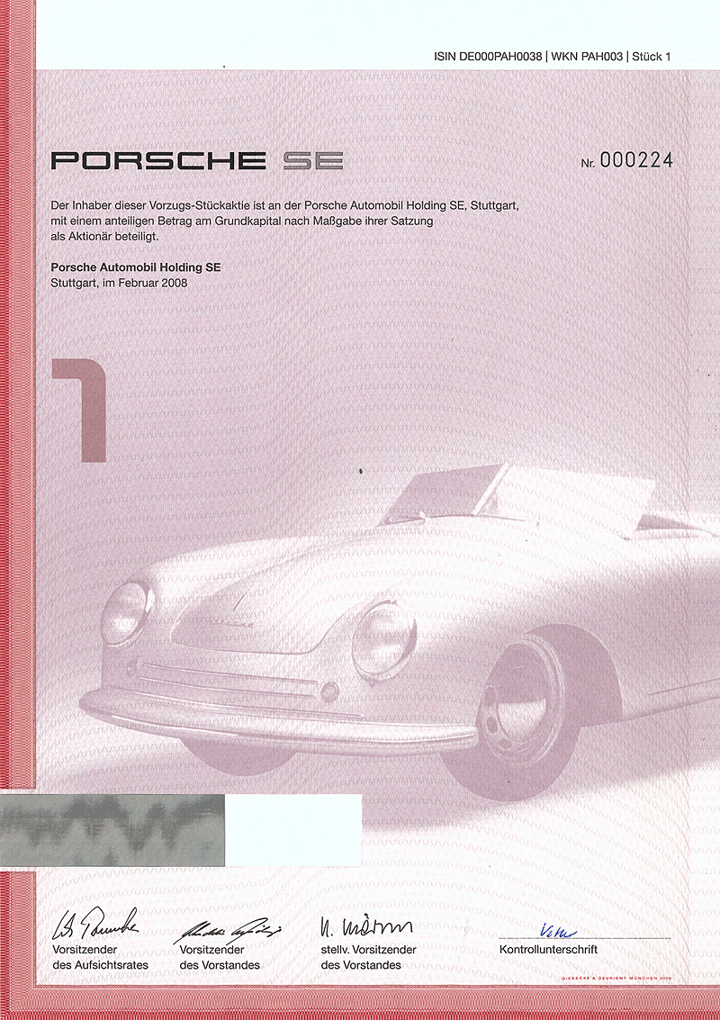 Der Name Ferdinand Porsche taucht seit der Wende zum 20. Jh. in der Geschichte des Automobils immer wieder auf: bei Lohner, bei Austro-Daimler, bei Daimler und Steyr und schließlich als Konstrukteur des legendären “Volkswagen”. Ab 1931 war Porsche mit seinem Konstruktionsbüro in Stuttgart ansässig, während des Krieges verlagerte er die Firma ins österreichische Gmünd. Hier entstand 1948 der erste “Porsche”, ein zweisitziger Sportwagen mit Aluminium-Karosserie und einem von VW abgeleiteten luftgekühlten Motor. Die erste Serie von 50 Fahrzeugen wurde in Österreich und teilweise in der Schweiz gebaut. 1950 wurde im Werk Stuttgart-Zuffenhausen die Produktion des Typ 356 aufgenommen. Der heute größte Sportwagenhersteller der Welt wurde 1973 in eine AG umgewandelt und ging 1984 mit Vorzugsaktien an die Börse. Die Stammaktien sind nach wie vor vollständig im Besitz der Familien Porsche/Piech. Nach dem fulminanten und Wellen schlagenden Einstieg bei VW 2008 Umwandlung in eine Holding. Sehr dekorativ, mit großer Abb. eines Porsche 356. Faksimile-Unterschriften von Wolfgang Porsche (AR) und Wendelin Wiedeking (Vorstand). Maße: 29,7 x 21 cm. Gültige Aktie mit komplettem Kuponbogen!
