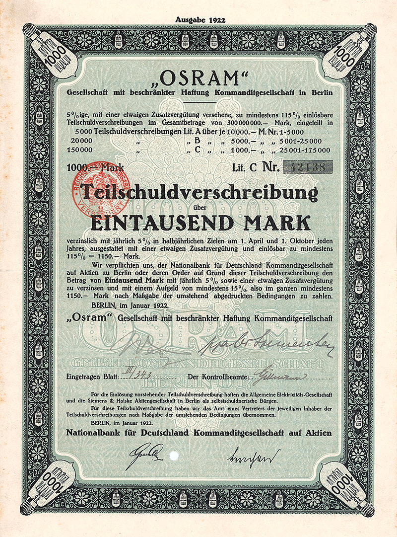 Aktie Lit. A 1.000 Mark, Nr. 188