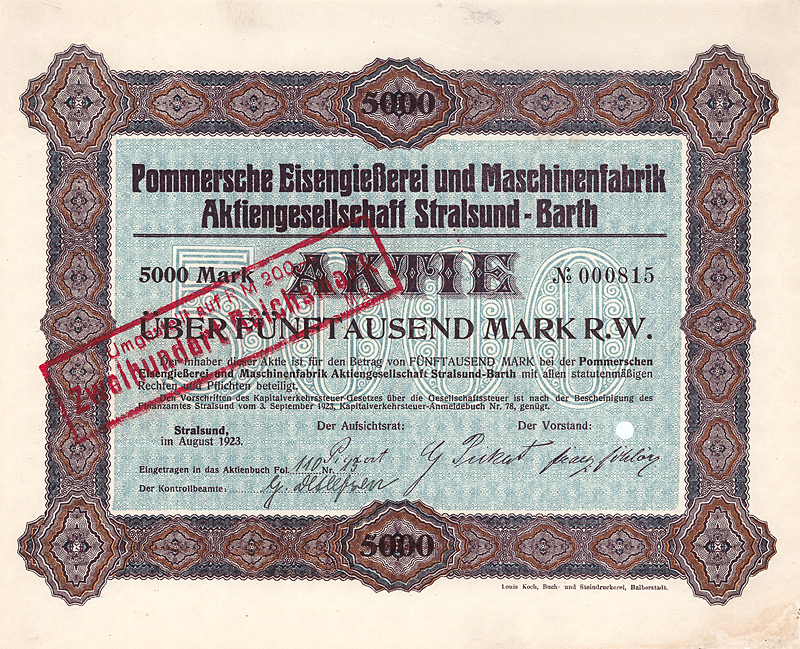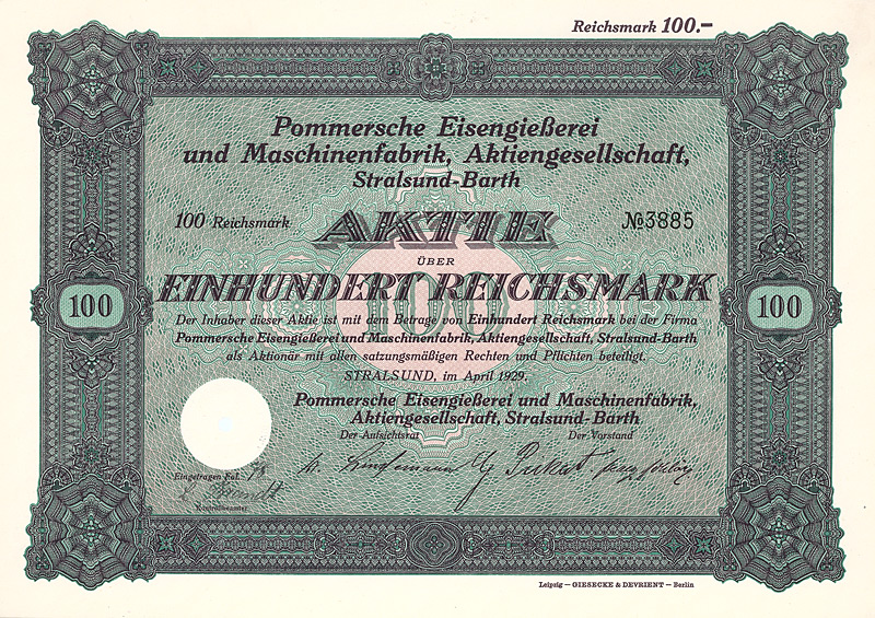 Auflage 1.000. Gründung 1899 unter Übernahme der AG Vereinigte Pommersche Eisengießerei u. Halle’sche Maschinenbau-Anstalt vorm. Vaaß & Littmann, Stralsund. Das Werk in Stralsund fertigte mit ca. 160 Leuten vornehmlich Pferderechen, Säemaschinen, Düngerstreuer und Kartoffelsortierer. Das mit 360 Leuten mehr als doppelt so große Werk in Barth fertigte Düngerstreuer, Walzen, Rübenschneider und Ölkuchenbrecher, außerdem Gießerei für Handelsguß. 1928 Schließung der Verkaufsfilialen Stettin, Neubrandenburg und Magdeburg. Nach 1946 als VEB Schiffsanlagenbau Zulieferer der Volkswerft Stralsund, 1971 dem VEB Schiffsanlagenbau Barth zugeordnet, 1991 als Schiffswerft Barth GmbH privatisiert. Lochentwertet. Maße: 18,5 x 22,6 cm.
