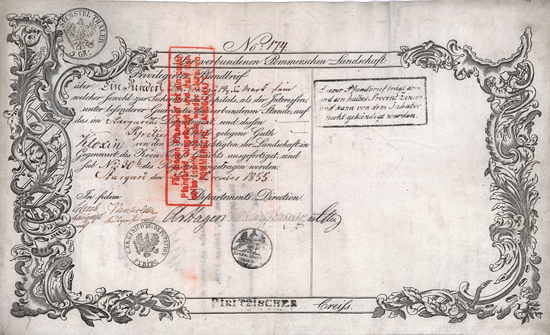 (R 11) Die Landschaften (Landschaftliche Kreditvereine) waren Verbände von (adligen) Gutsbesitzern, durch deren Vermittlung sich Gutsbesitzer unter solidarischer Haftung aller anderen Mitglieder und durch Ausgabe von Pfandbriefen günstigen Kredit verschaffen konnten. Wegen des Drucks auf Schweinshaut wurden diese Wertpapiere allgemein “lederner Brief” genannt. Die Güter der Mitglieder wurden taxiert. Jedes Mitglied konnte bis 2/3 des Taxwertes die Ausgabe von Pfandbriefen veranlassen. Der Emissionsbetrag floss dem jeweiligen Gutsbesitzer unmittelbar zu. Die Pfandbriefe lauteten auf den Inhaber, wegen der deswegen leichten Handelbarkeit waren es die ersten in Berlin börsennotierten Wertpapiere. Erst nach der Ausgabe setzte die Tätigkeit der Landschaft ein, indem sie die Vermittlung der Zins- und Tilgungszahlungen übernahm. Die älteren Pfandbriefe waren speziell hypothekarisch durch das betreffende Gut sichergestellt und außerdem noch durch die Gesamtheit der Güter aller Mitglieder der Landschaft. Später erfolgte, wie bei den Pfandbriefen der inzwischen entstandenen Hypothekenbanken, die Bezugnahme umlaufender Pfandbriefe auf den Deckungsstock. Die Gründung der Landschaften gilt als Verdienst Friedrichs des Großen, der durch Kabinettsorder vom 15.7.1770 die Errichtung der Landschaft für die Provinz Schlesien genehmigte. Die bis Kriegsende in Stettin ansässige Pommersche Landschaft (Gründung 13.3.1781) ist die drittälteste Landschaft. Für die Ausführung allgemeiner Bankgeschäfte neben dem Realkredit gliederte sie sich später die “Landschaftliche Bank der Provinz Pommern” an. Hypothekarisch gesichert durch das im Stargarder Departement und dessen Pyritzer Kreis gelegene Gut Kloxin. Dekorativer Druck auf Schweinshaut. Über 100 Jahre im Umlauf, 1928 im Grundbuch gelöscht. Mit Originalunterschriften. Maße: 18,8 x 31,4 cm. Einschnittentwertung.