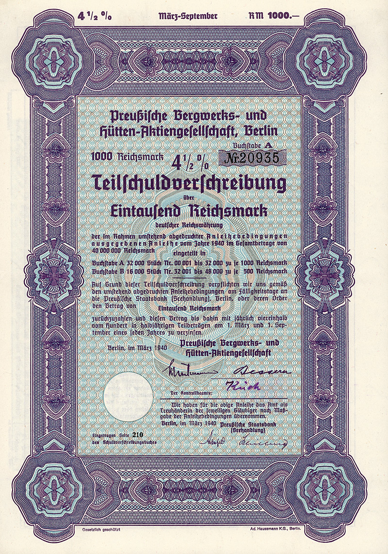 Auflage 32.000. Bei der Gründung 1923 brachte der Preußische Staat seinen gesamten Montanbesitz ein. Dazu gehörten Kohlenbergwerke in Hindenburg O.-S. und Ibbenbüren, Kaliwerke in Staßfurt, Bleicherode, Vienenburg und Buggingen (Baden), vier Salinen sowie die Harzer und Unterharzer Berg- und Hüttenwerke in Goslar und Oker (darunter das berühmte 1000-jährige Erzbergwerk im Rammelsberg). Ferner Bernstein-Tagebau im ostpreußischen Palmnicken und Betrieb der Staatlichen Bernstein-Manufaktur Königsberg i.Pr., der Rüdersdorfer Kalksteinbrüche und Zementfabriken und der Sodafabrik Staßfurt. Nach dem Krieg verlegte die Preussag ihren Sitz nach Hannover. 1959 war die Preussag im Zuge der Reprivatisierung die erste “Volksaktie” (es folgten 1961 Volkswagen und 1965 die VEBA). Die Montan-Aktivitäten (darunter als bedeutendste die Beteiligung an der Stahlwerke Peine-Salzgitter AG) wurden in den 1990er Jahren schrittweise abgestoßen und die Preussag wandelte sich zu einem Reise- und Tourismus-Konzern. 2002 wurde die Gesellschaft konsequenterweise in TUI AG umbenannt. Als letzte große Nicht-Touristik-Aktivität wurde Ende 2002 die Öl- und Gasexploration an die Gaz de France verkauft. Maße: 30 x 21,2 cm. Doppelblatt, inwendig Anleihebedingungen. Linker Rand mit Abheftlochung.
