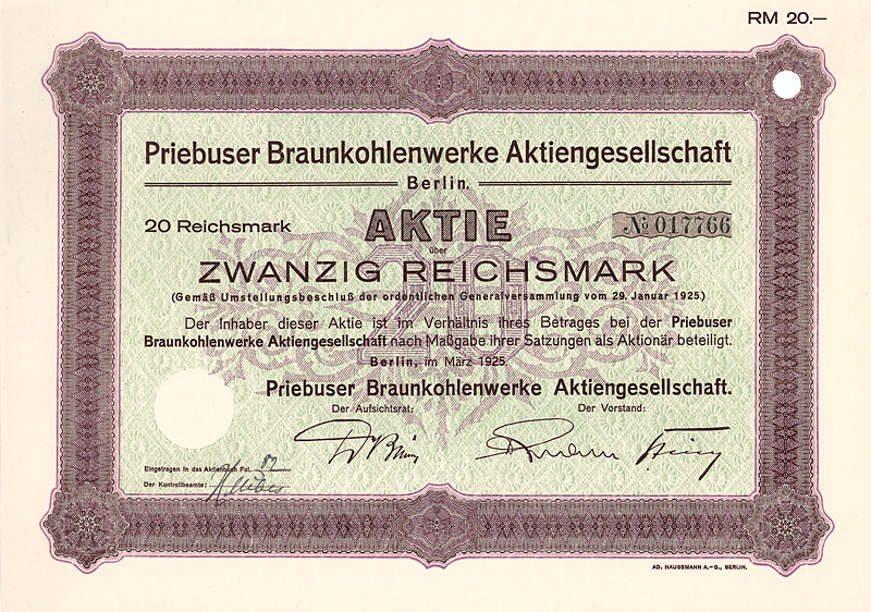 Auflage 1.000. Gründung 1921 zwecks Erwerb und Betrieb von Braunkohlengruben bei Priebus nach Zusammenschluss der folgenden Gewerkschaften: Silesia-Louis, Anna-Bruno, Anna-Martha, Bruno, Louis, Annemarie, Ino und Curt, allesamt in Nieder-Schlesien bzw. der Lausitz gelegen. Bereits im Juni 1924 Einstellung der Förderung wegen Absatzschwierigkeiten, Mitte 1925 wurde auch die Wasserhaltung eingestellt. Großaktionäre: Ilse-Bergbau-AG und Braunkohlen- und Brikett-Industrie-AG - Bubiag (je 49 %). 1939 in eine GmbH umgewandelt. Lochentwertet. Maße: 21 x 29,7 cm.