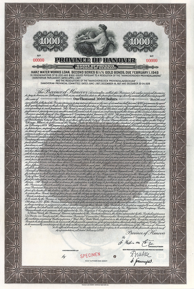 Nullgeziffertes Specimen (R 10). Schon in alten Zeiten wurde der Wasserreichtum des Harzes von den Bergleuten genutzt, die dazu eine Unzahl von Teichen und kunstvolle Grabensysteme anlegten. In den 20er Jahren beschloß dann der Hannoversche Provinziallandtag die Gründung der Harzwasserwerke, deren Talsperren neben dem Hochwasserschutz des Vorlandes und der Kraftgewinnung in erster Linie der Trinkwasserversorgung dienen sollten (das Versorgungsgebiet erstreckt sich heute bis nach Bremen). Nacheinander entstanden die Sösetalsperre, die Eckertalsperre (wo nach dem Krieg mitten auf der Staumauer die Zonengrenze verlief), die Okertalsperre, die Innerstetalsperre und als letzte 1969 die Granetalsperre. Hochwertiger Stahlstich mit allegorischer Vignette, Druckerei: Franklin Lee Division - American Bank Note Co. Maße: 38,2 x 25,5 cm. Mit anh. Kupons, lochentwertet.